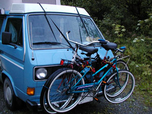 We bought an inexpensive bike rack from Wal-mart for less than $30. It was designed to go on the back of an SUV or the trunk lid of a sedan. We mounted it on the front of the van using the tie-down points in the luggage rack on the roof and the bumper. We carried two bikes like this from Ohio to Fairbanks and down to Nevada; yep, on the Alaska Highway and worse. It made us drive a little more carefully through the bumps, but was reasonably stable through all but the worst. One word of caution, however, keep the rack and the front of the van clean when doing this. I'm sure the rack would damage the paint if you drove far with grunge under it.